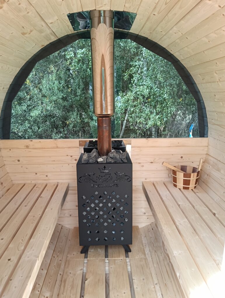 Nasza łaźnia parowa, jest opalana drewnem, dzięki temu jest bardziej energooszczędna. Wbudowane ledy tworzą miłą atmosferę wewnątrz niej.